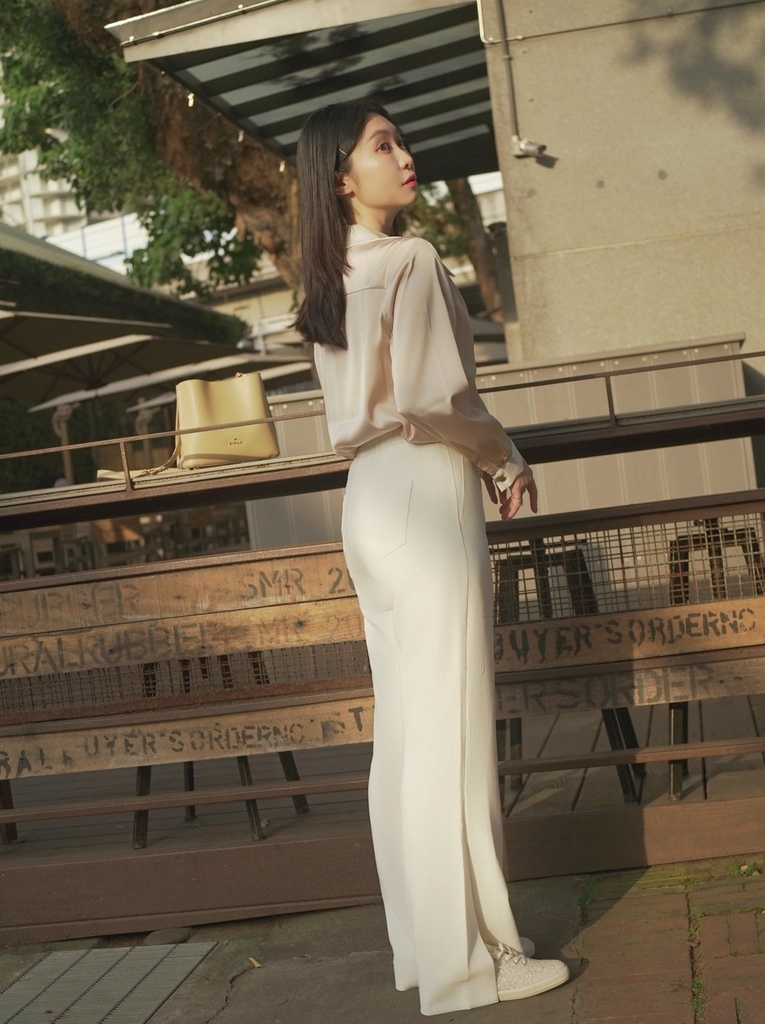 某天特地試了白色襯衫搭配白長褲的極簡俐落造型