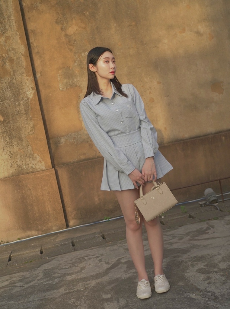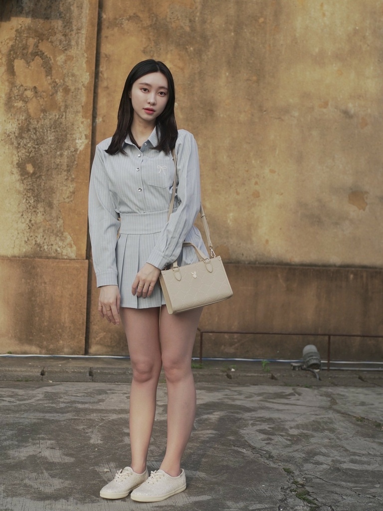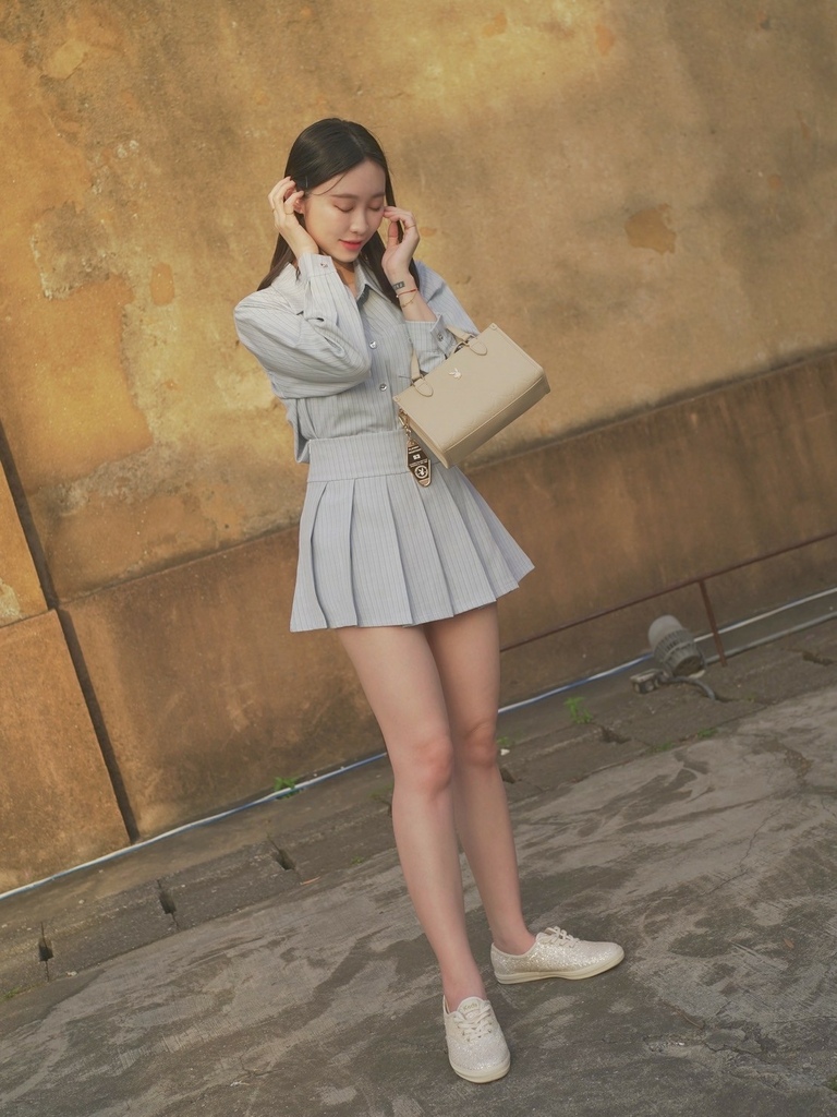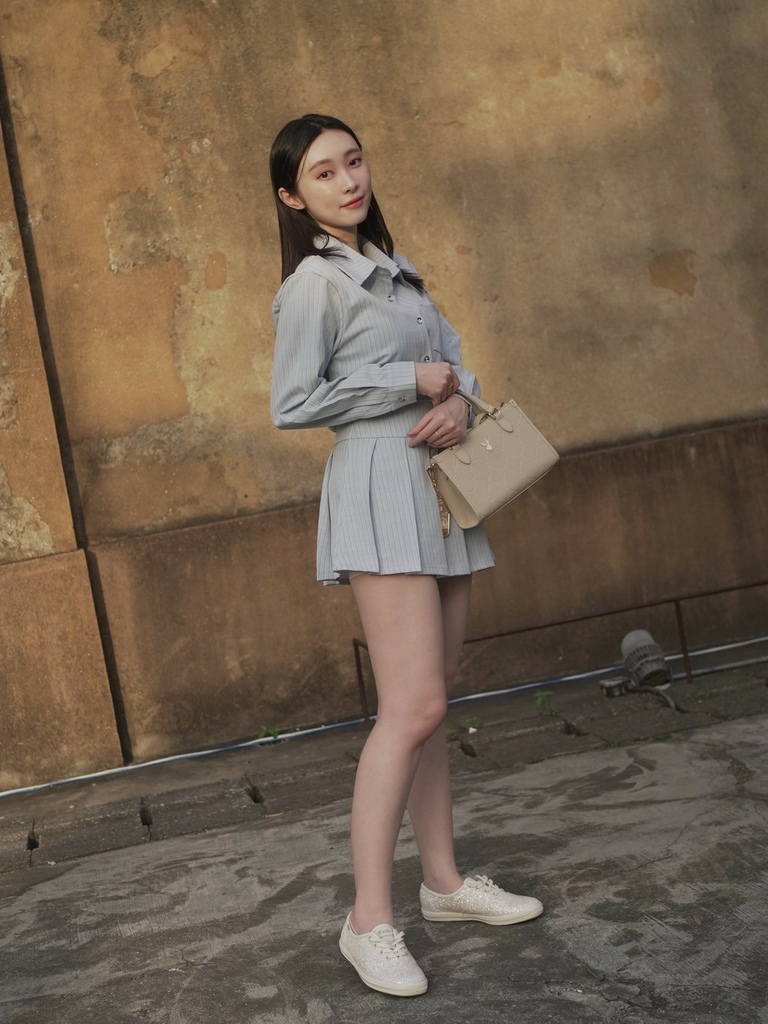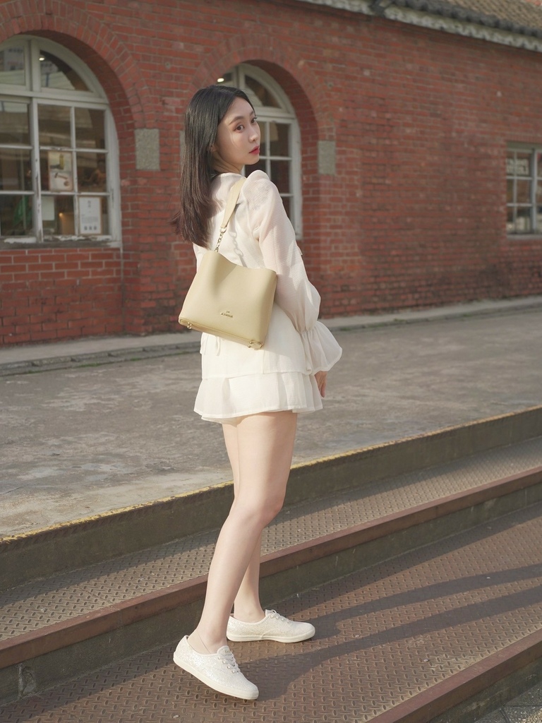 而鞋子的亮片細節又偷偷為這一身素色搭配加了一點點小亮點