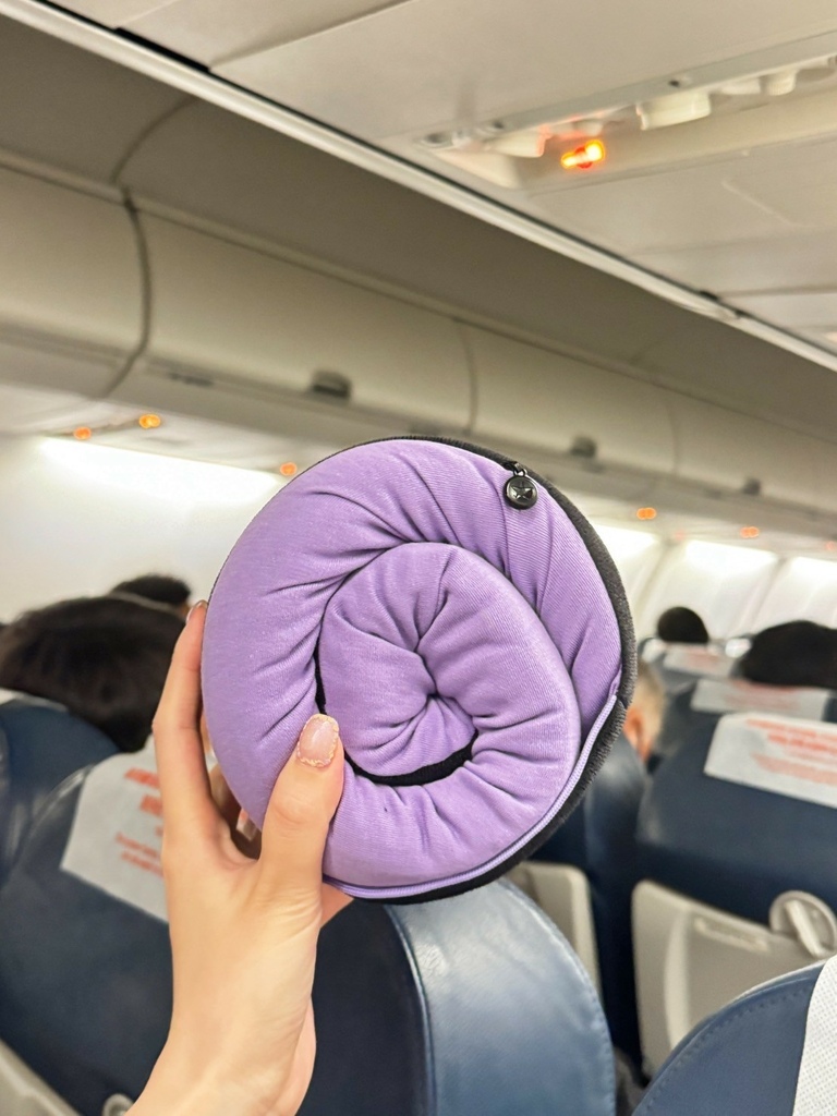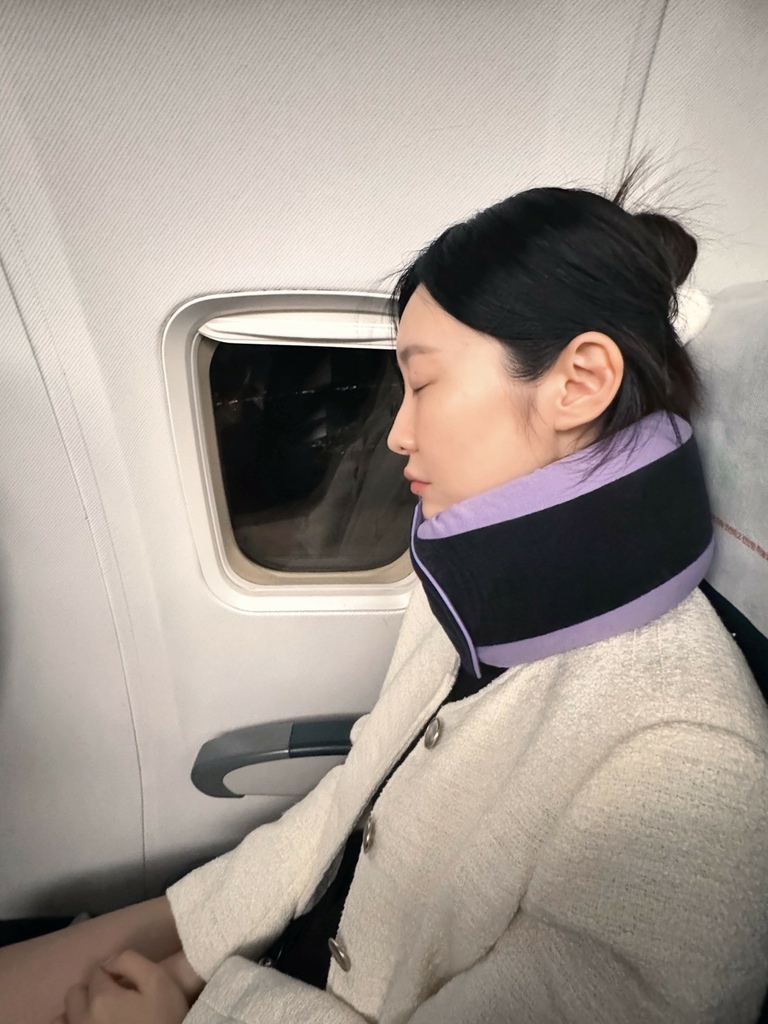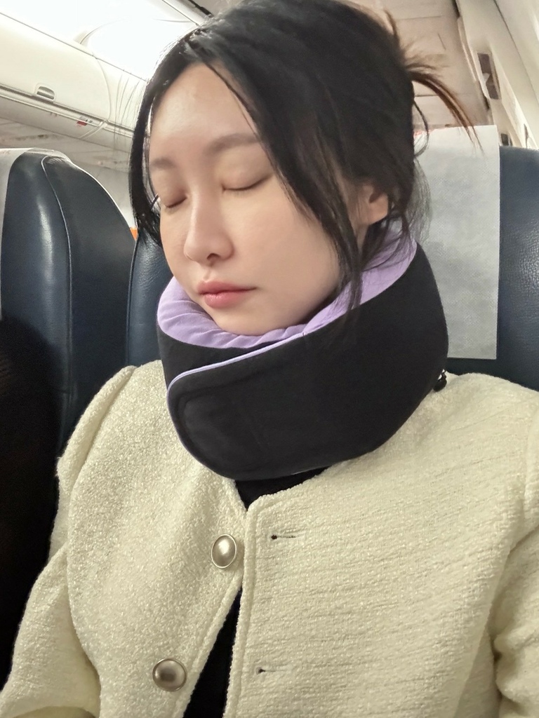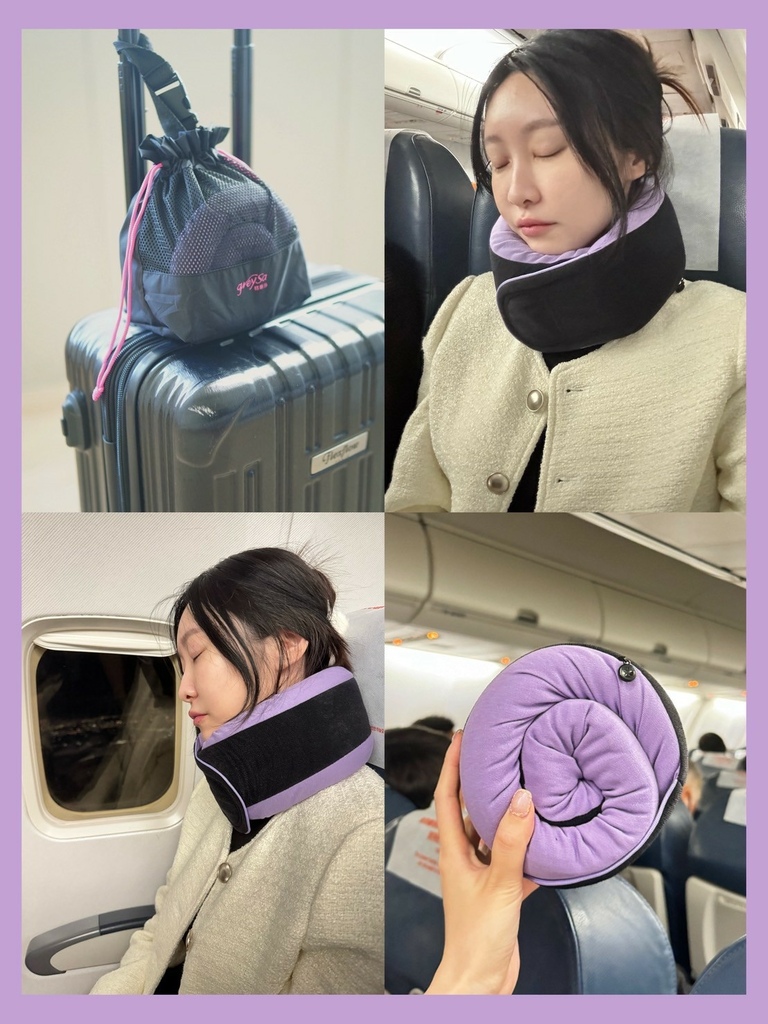 坐在飛機上戴著 GreySa 格蕾莎全家福旅行頸枕