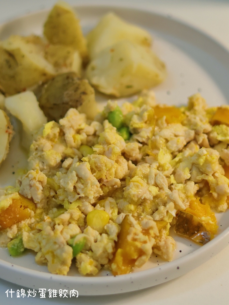 成分:雞胸肉、雞蛋、南瓜、毛豆仁、玉米粒、鹽巴、橄欖油。